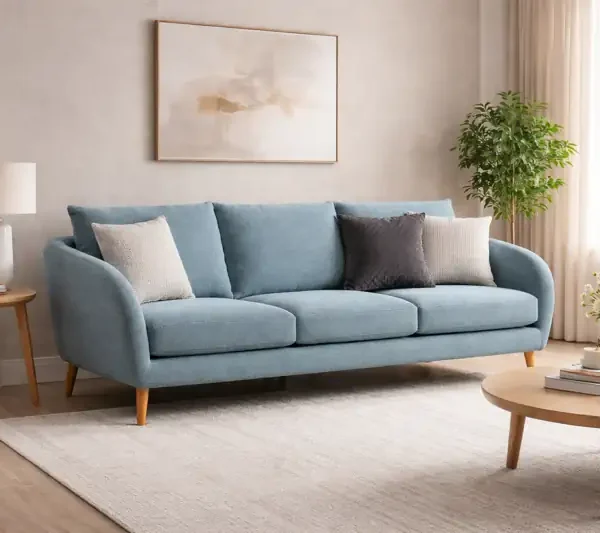 This sofa features a smooth curved armrest design with a balanced three-seater layout, offering both style and functionality. The soft blue tone adds a refreshing and calming feel to your interior, making it ideal for modern and minimal spaces.Comfort & Durability