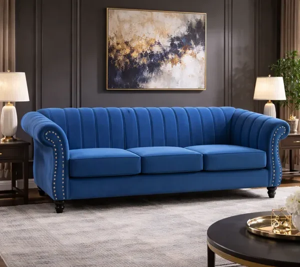 This sofa features a refined Chesterfield-inspired structure with smooth channel tufting and stylish rolled arms enhanced with nailhead accents. The deep royal blue color adds richness and sophistication to any interior.Luxury Comfort & Durability
