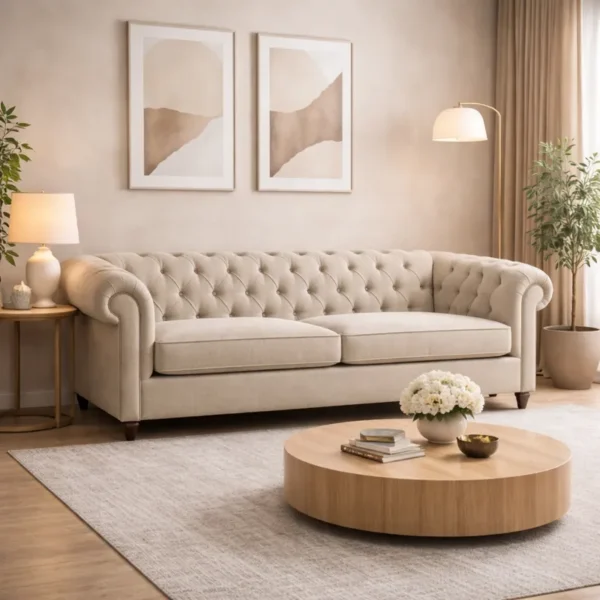 This sofa showcases the iconic Chesterfield style with deep button tufted backrest and curved rolled arms. Its elegant beige tone enhances the overall look, making it a perfect centerpiece for both classic and contemporary interiors.Premium Comfort & Strong Build