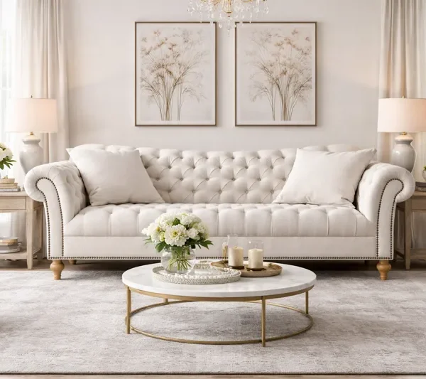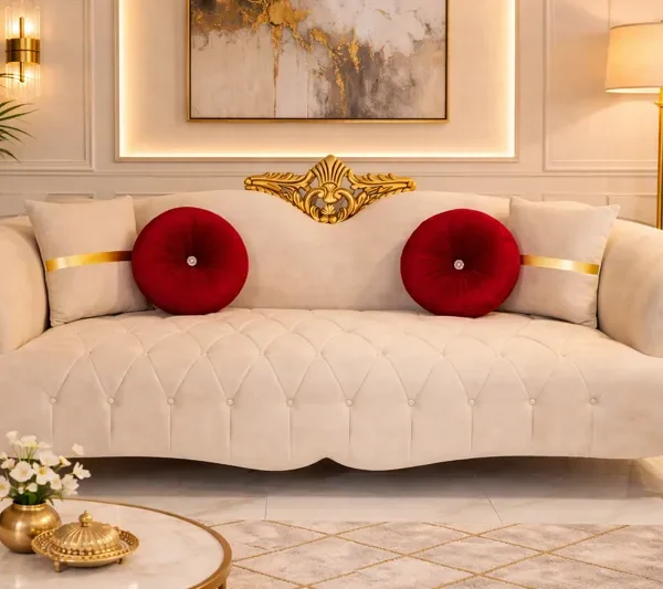 Transform your living space with this luxurious cream 3 seater sofa, designed with elegant diamond tufting and premium gold detailing. This sofa offers a perfect combination of royal aesthetics and modern comfort, making it a standout centerpiece for high-end interiors.