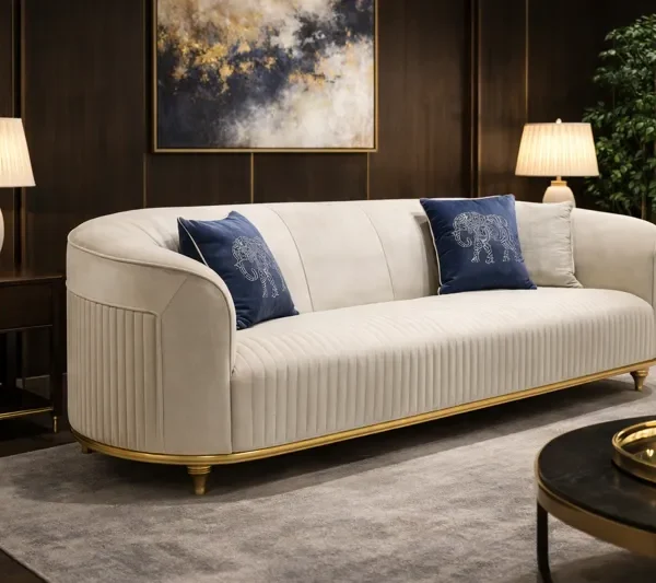 Transform your living space with this stunning cream curved 3 seater sofa, designed to bring modern luxury and elegance into your home. Featuring a smooth curved silhouette, vertical channel tufting, and a premium gold base, this sofa is a perfect statement piece for sophisticated interiors.