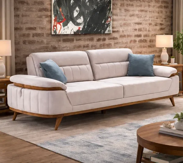 Bring a perfect balance of elegance and warmth into your living space with this modern cream 3 seater sofa, beautifully enhanced with wooden accent detailing. Its soft neutral tone and sleek design make it an ideal choice for both contemporary and classic interiors.