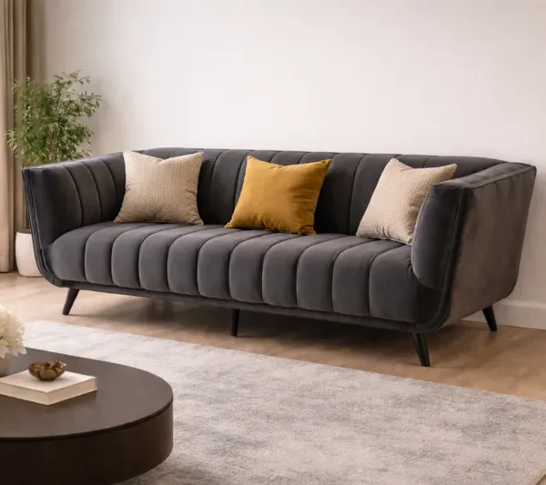 Bring modern elegance into your home with this stylish dark grey 3 seater sofa, crafted with a sleek structure and premium channel tufted detailing. Its rich tone and refined design make it a perfect centerpiece for contemporary and luxury interiors.