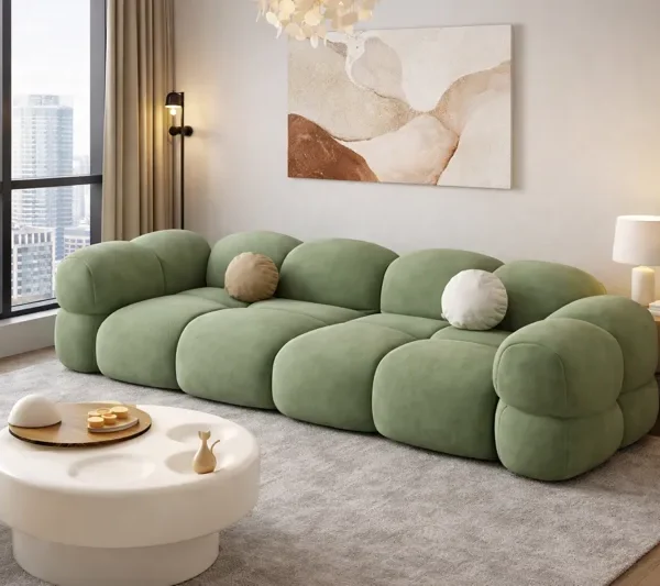 This sofa features a distinctive bubble-inspired structure with soft rounded forms, creating a luxurious and cozy appearance. The modern design adds a creative and stylish touch to any living room.Trendy Green Color Finish