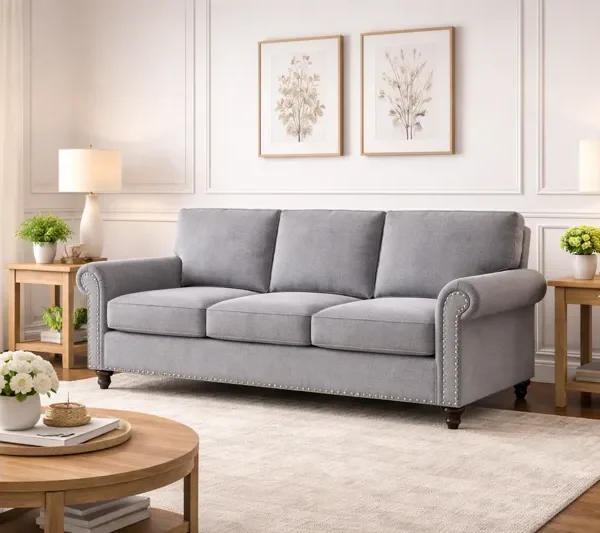 This sofa features beautifully rolled armrests with stylish nailhead trim, giving it a sophisticated and classic look. The light grey color adds a soft and elegant touch that blends easily with any décor style.Premium Comfort & Durability