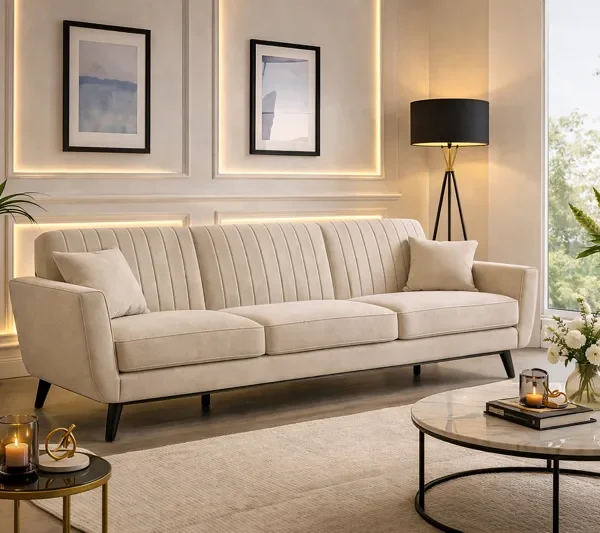 Enhance your living space with this elegant beige 3 seater sofa, designed with a sleek modern structure and refined channel tufted detailing. Its neutral tone and premium finish make it a perfect centerpiece for contemporary interiors.