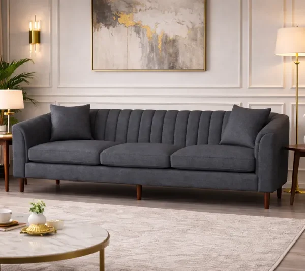 This sofa features vertical channel tufting that adds texture and depth to its overall design. The dark grey color gives a bold yet sophisticated appearance, making it a standout centerpiece for modern living rooms.Premium Comfort & Durability