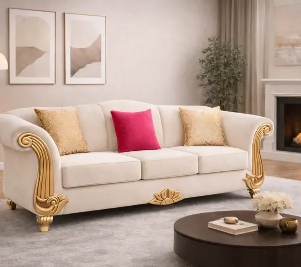 Featuring beautifully crafted gold detailing on the arms and base, this sofa reflects a timeless royal aesthetic. The soft off-white tone enhances its premium look, making it ideal for luxury interiors and sophisticated home décor.Premium Comfort & Durability