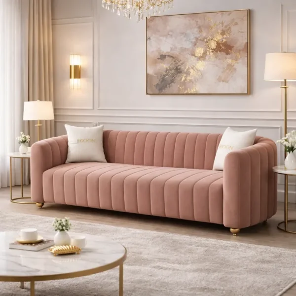 This sofa features a stylish channel tufted design with a curved silhouette, giving it a premium and contemporary look. The blush pink tone adds warmth and elegance, making it a perfect centerpiece for modern and luxury interiors.Premium Comfort & Durability