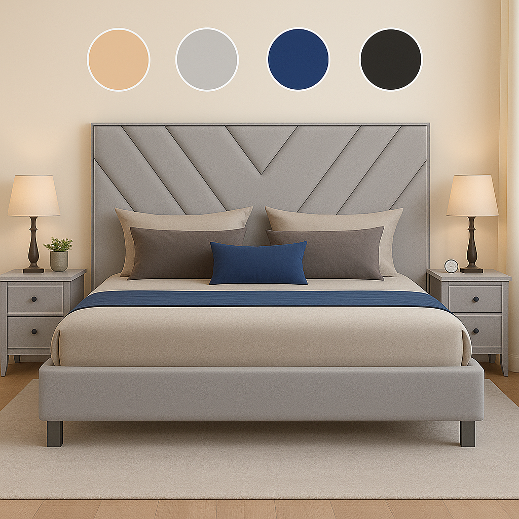 sophisticated interiors. The bed’s sleek silhouette, premium fabric, and padded headboard