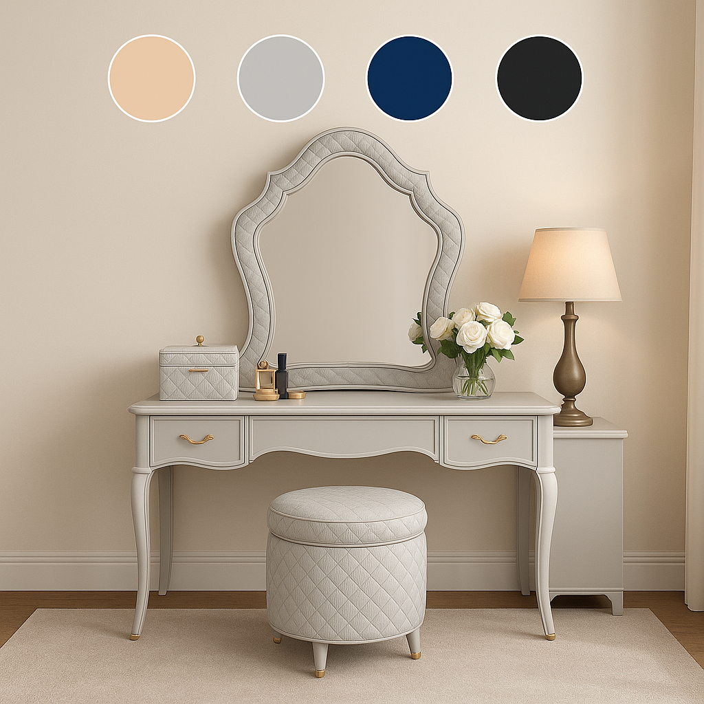 offer both comfort and style, while the vanity’s quilted details and ornate mirror frame