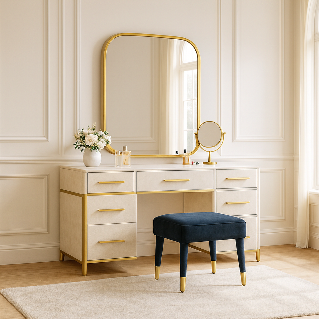 A luxurious cream & gold bedroom suite — padded headboard bed paired with an elegant makeup vanity.
