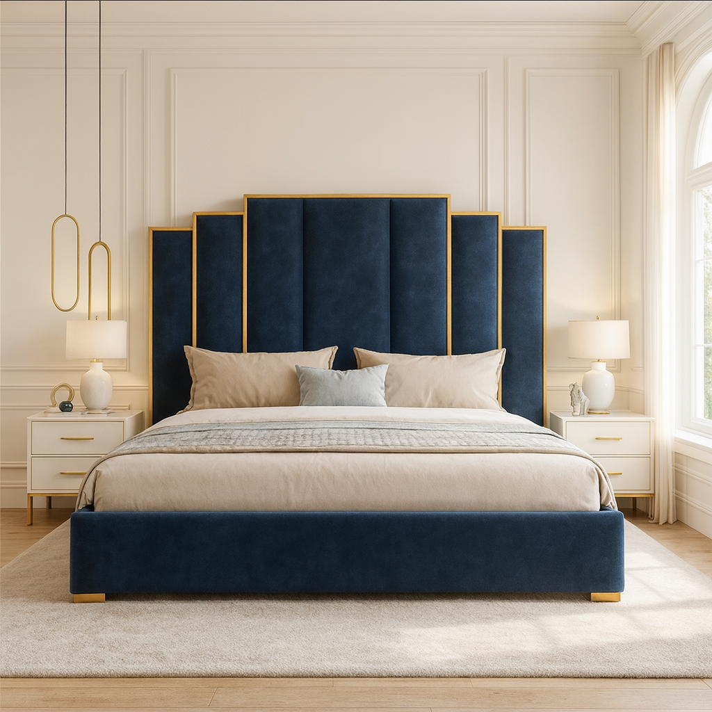 High-gloss MDF, premium upholstery on headboard, gold-plated metal accents, high-quality hardware.