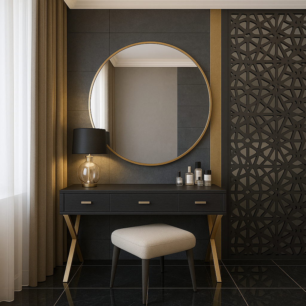 and a refined makeup vanity with a round, gold‑framed mirror—designed for modern luxury bedrooms.