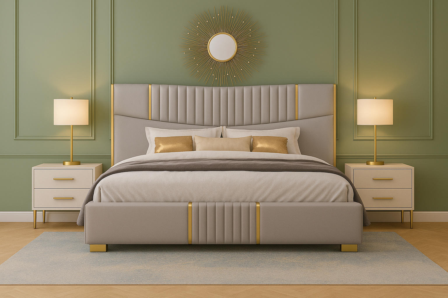 High-gloss MDF, premium upholstery on headboard, gold-plated metal accents, high-quality hardware.