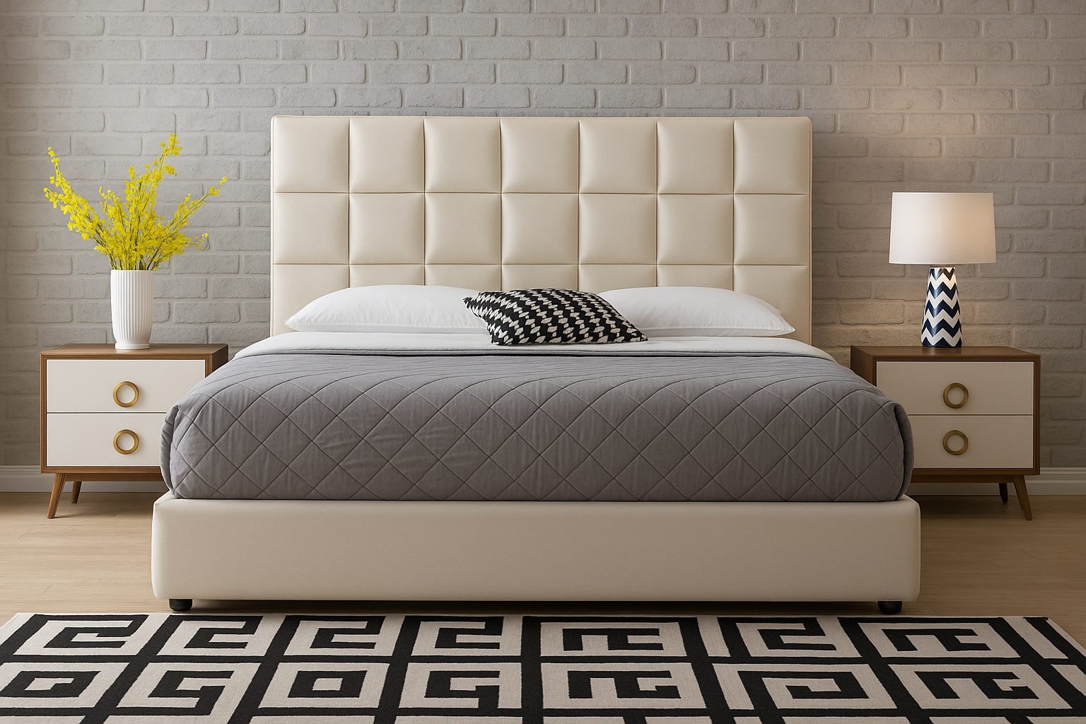 A modern, quilted-upholstery bedroom set in a timeless ivory tone. The