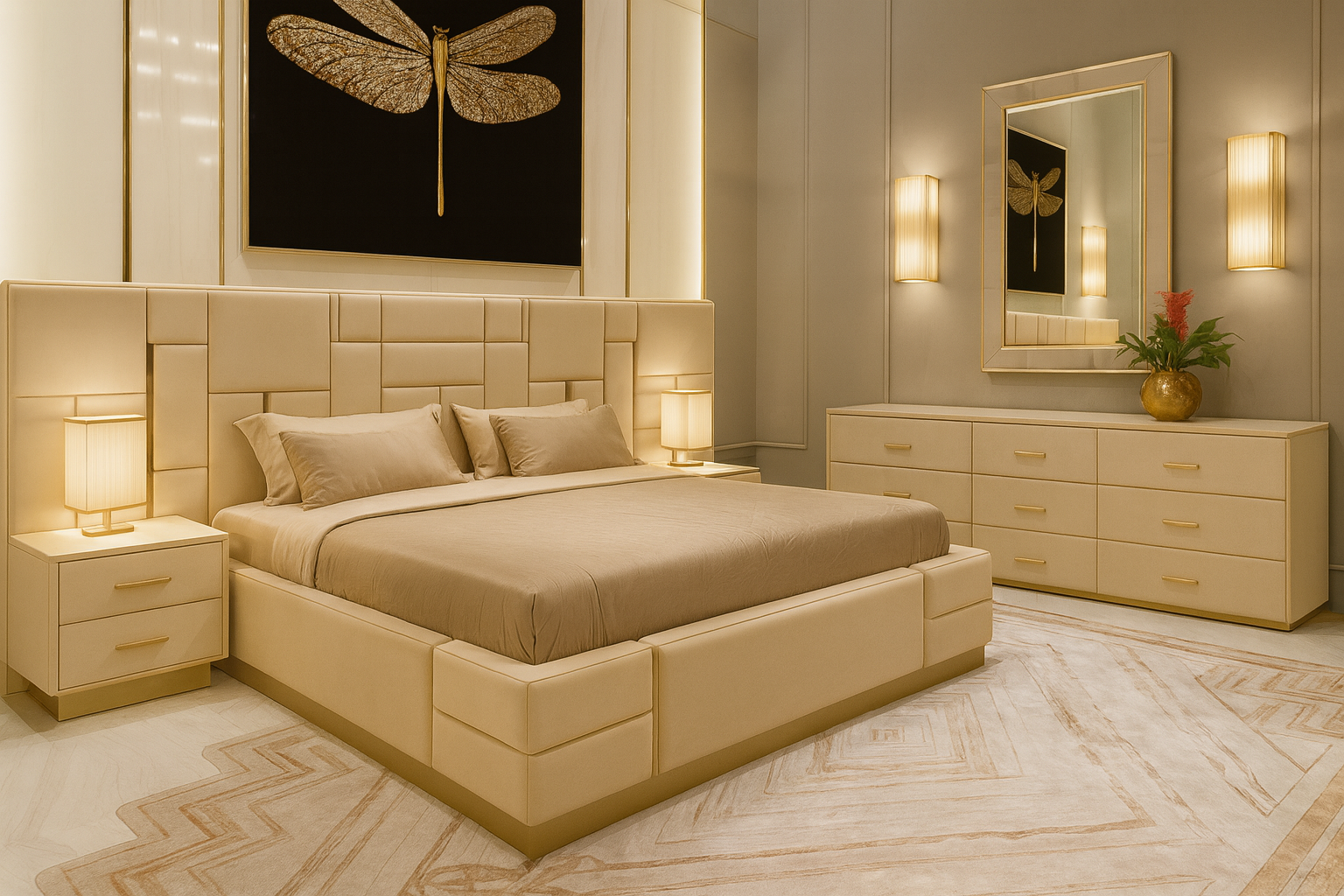 Experience unmatched elegance with the Platinum Grid Luxe bed set — a refined blend of modern design and luxury comfort. The striking geometric upholstered headboard creates a bold focal point, while the premium platinum velvet finish and subtle gold accents elevate any interior. Paired with sleek side tables and a spacious 6‑drawer dresser, this set delivers style and smart storage in one.