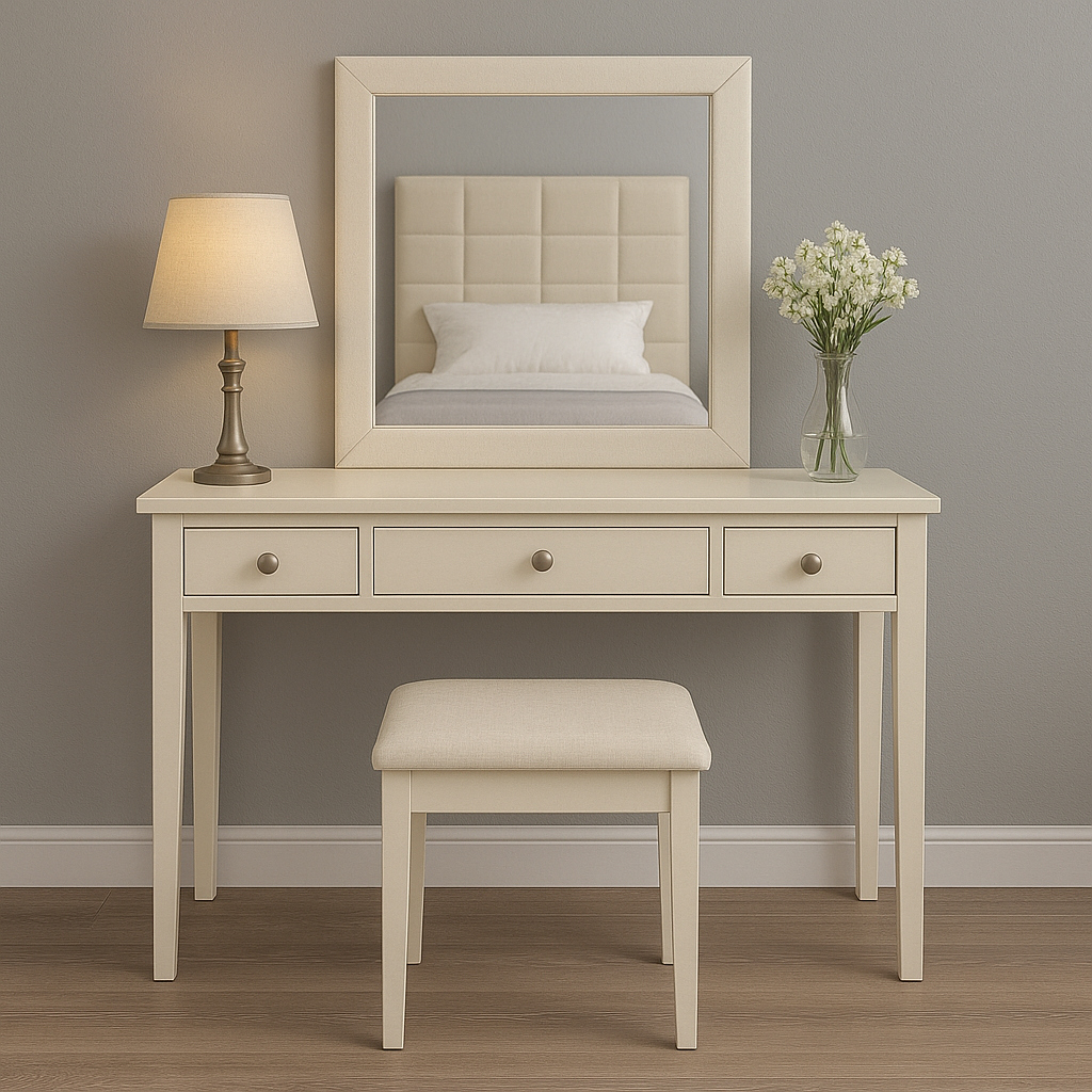 A luxurious cream & gold bedroom suite — padded headboard bed paired with an elegant makeup vanity.