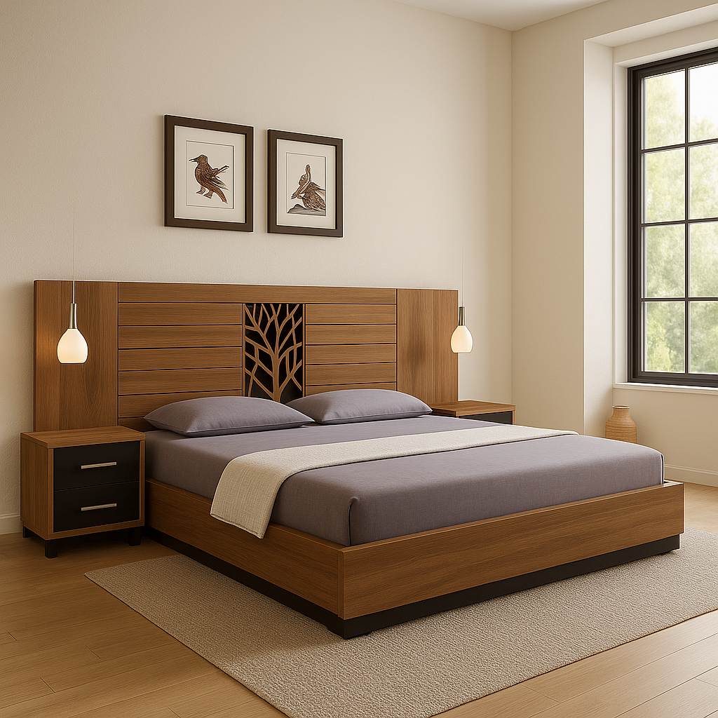 The signature headboard features a tree-inspired cutout framed by clean horizontal panels,