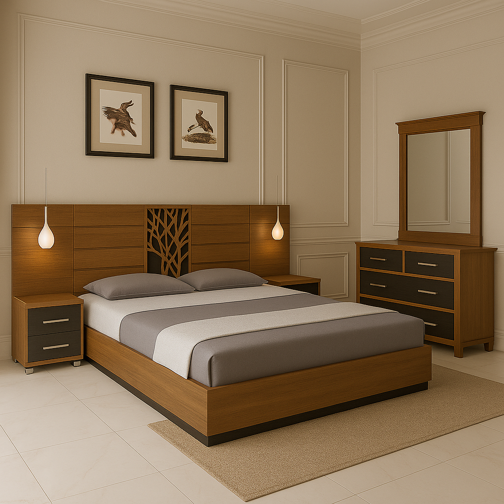 | Dressing Table + Mirror | Customizable | Wide top, 4 drawers; framed mirror |