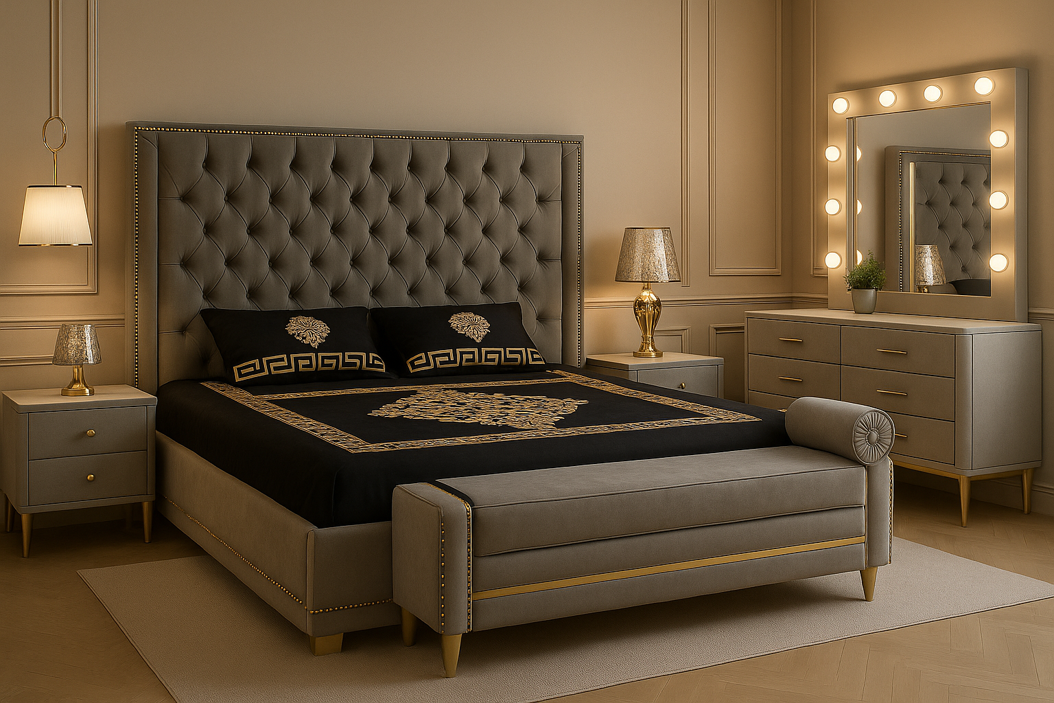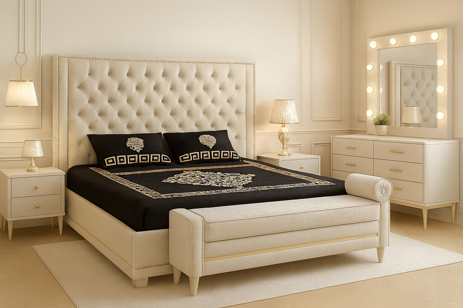 A luxurious cream & gold bedroom suite — padded headboard bed paired with an elegant makeup vanity.