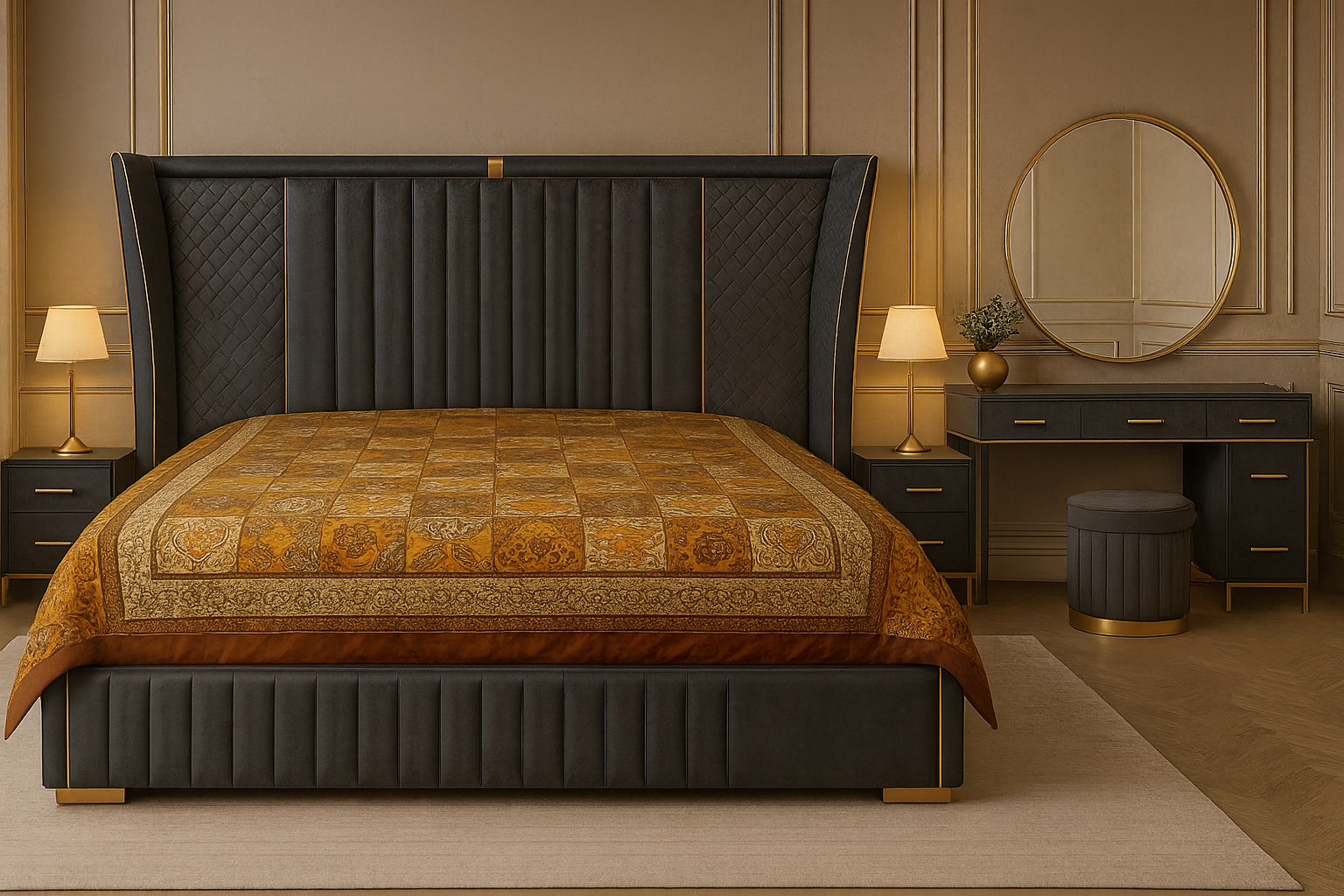 Elevate your bedroom with the Midnight Gold Prestige bed set — a masterpiece of style, comfort, and sophistication. Featuring a plush deep charcoal-black upholstered headboard with diamond quilting and gold-trim accents, this bed exudes modern elegance. The matching side tables, finished with sleek gold handles, complete the luxurious aesthetic while offering practical storage.