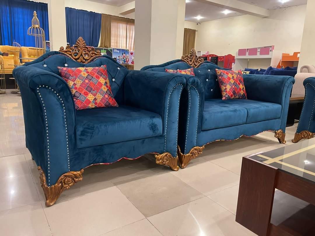 - Premium velvet/leatherette upholstery in azure/navy
