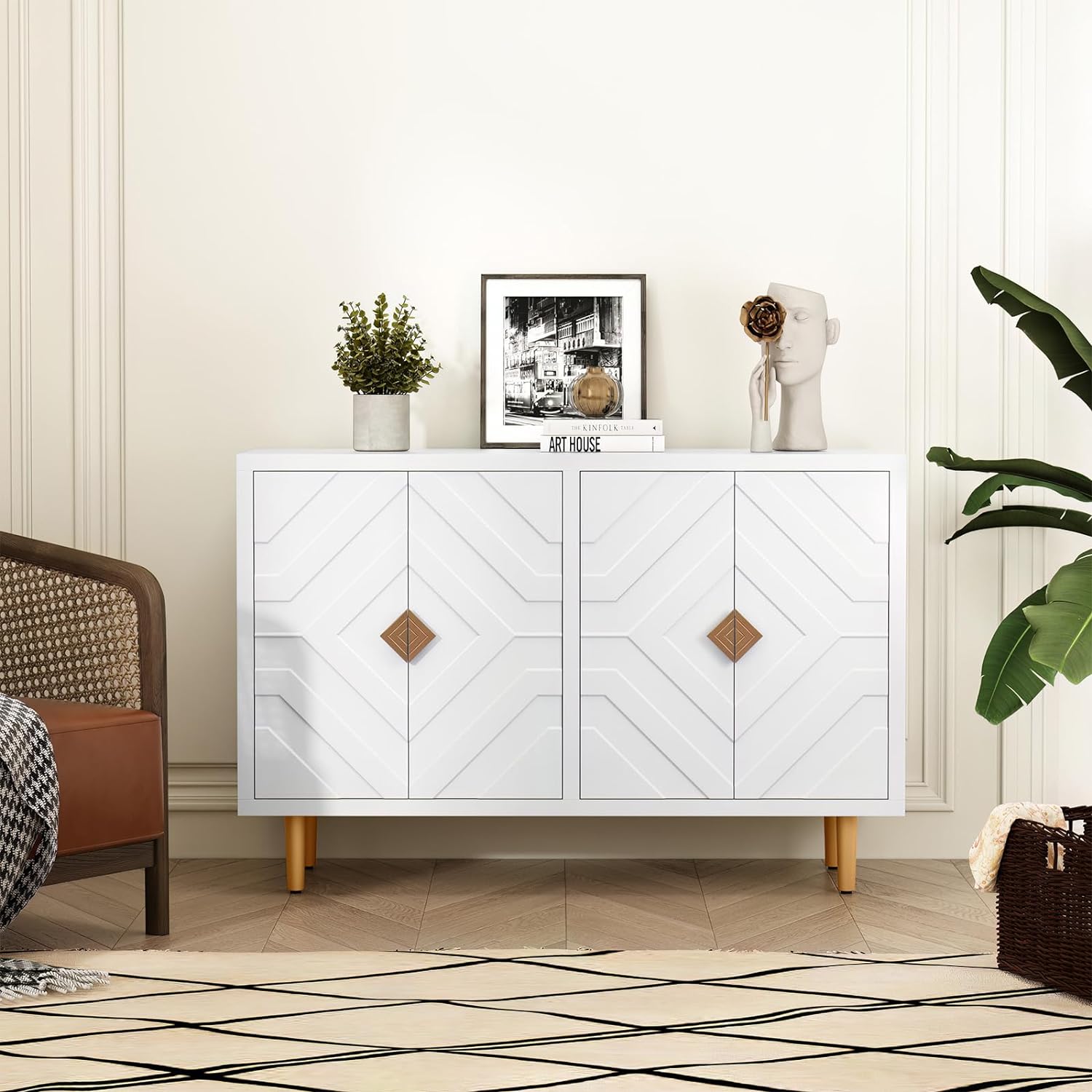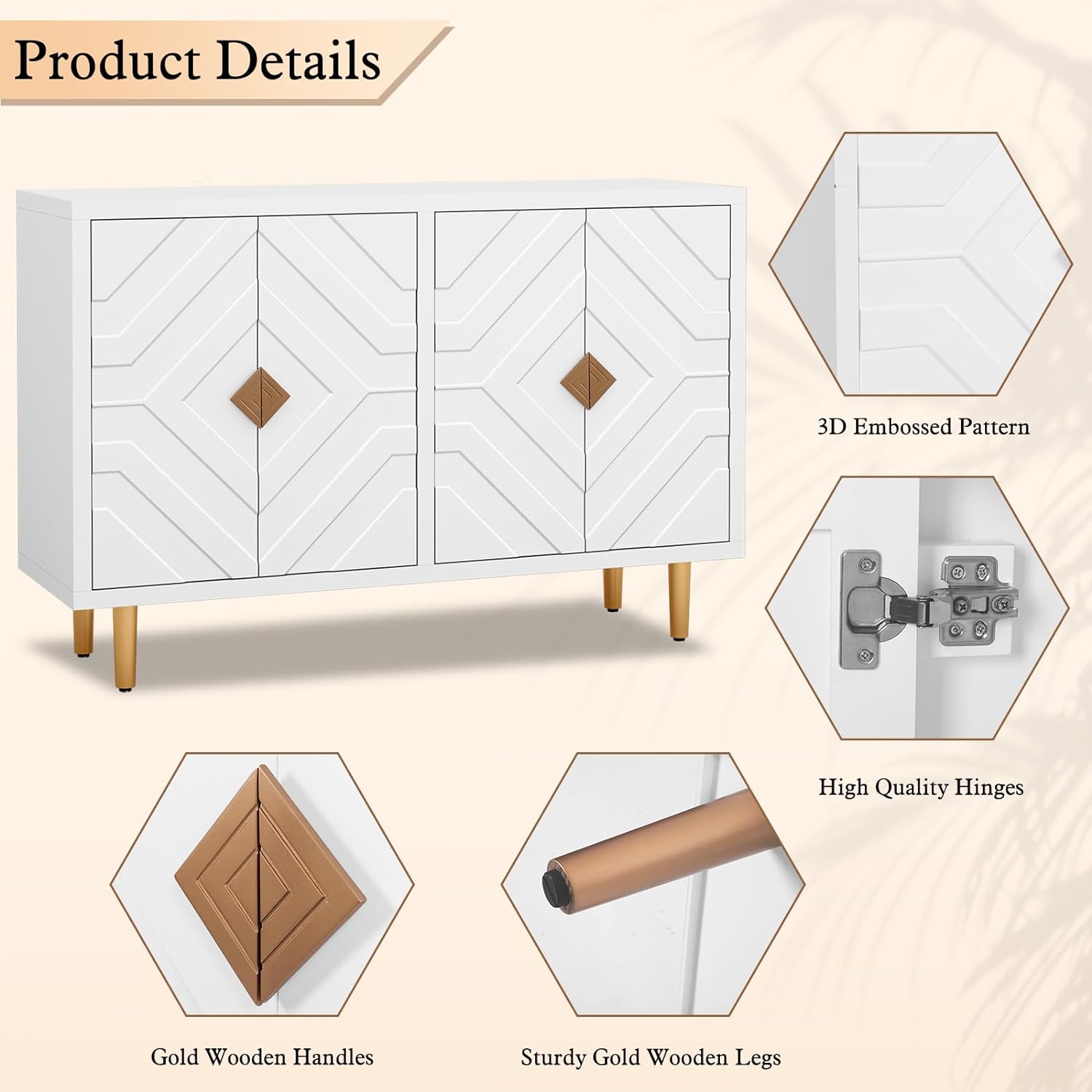 - High-gloss cream finish with tasteful golden accents