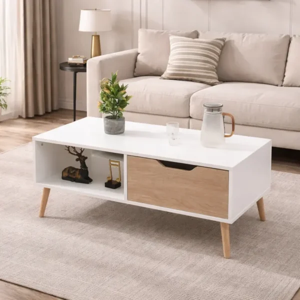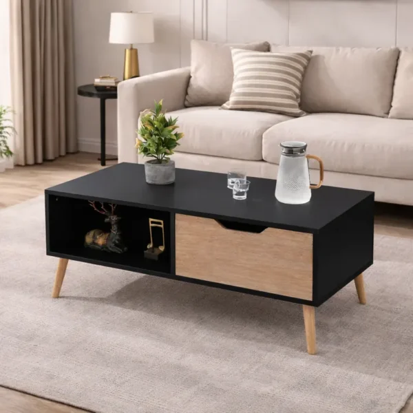 Upgrade your living space with this stylish and functional coffee table, designed with a modern minimalist look and smart storage features. The sleek top surface combined with a wooden drawer and open shelf creates the perfect balance of beauty and practicality for everyday use.