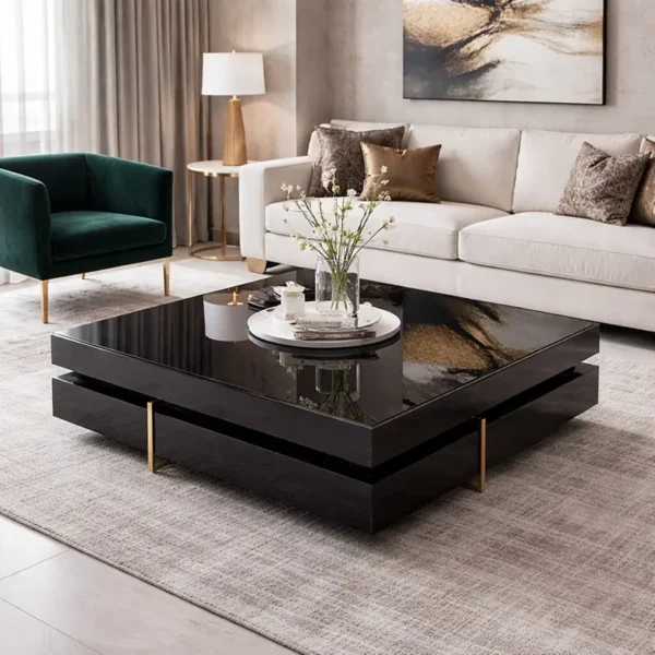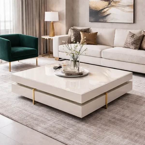 Elevate your living space with this premium square coffee table, designed to bring modern elegance and luxury into your home. Featuring a sleek glossy off-white finish with subtle gold accents, this table creates a sophisticated centerpiece for contemporary interiors.