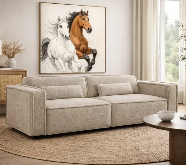 This sofa is crafted with a sleek modern profile, broad armrests, supportive back cushions, and a refined minimalist structure that blends beautifully with luxury, neutral, and contemporary home décor themes. The beige boucle texture adds softness and a premium designer-inspired look.Premium Comfort & Durability