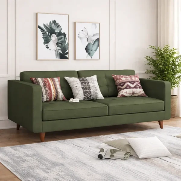 This sofa is crafted with a sleek modern profile, straight arm styling, deep comfortable seats, and a refined minimalist structure that blends beautifully with luxury, modern, and natural-tone interiors. The olive green shade adds warmth and a premium designer-inspired touch to your room.Premium Comfort & Durability