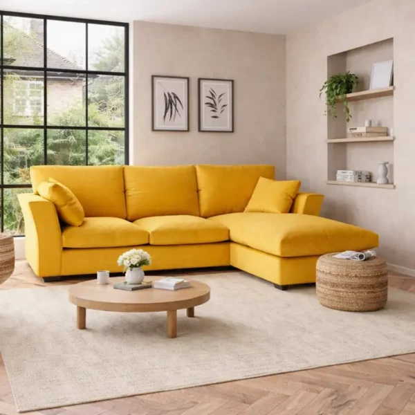 Brighten up your living space with this stylish yellow L-shape corner sofa, designed to deliver comfort, functionality, and a modern aesthetic. Its vibrant color and spacious layout make it a perfect centerpiece for contemporary homes.